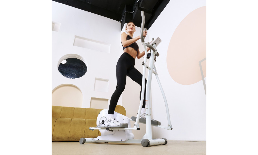 Длина шага составляет 36 см, а расстояние между педалями — 20 см, что обеспечивает комфорт и безопасность во время занятий. Транспортировочные ролики и компенсаторы неровности пола делают тренажёр мобильным и устойчивым.
