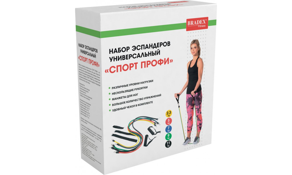 Набор эспандеров универсальный СПОРТ ПРОФИ – это настоящий комплекс тренажеров у Вас дома. Теперь Вы сможете достичь стройных форм и обрести крепкие, сильные мышцы без посещения тренажерного зала. С универсальным набором эспандеров СПОРТ ПРОФИ Вы составите свою программу тренировок и сможете подобрать подходящую нагрузку для всех групп мышц. Преимущества: • Возможность подобрать требуемое сопротивление для достижения наилучших результатов • Удобные рукоятки с нескользящим мягким покрытием • Манжеты для закрепления на ногах гарантируют отсутствие повреждений кожи • Огромный перечень упражнений • Удобный чехол для хранения и транспортировки